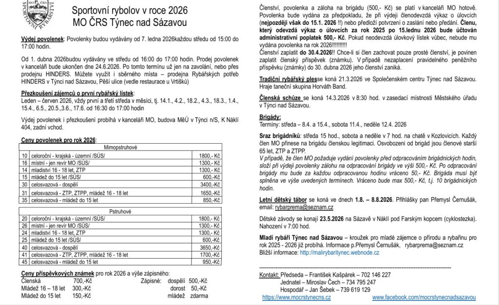 ČRS, z. s., místní organizace Týnec nad Sázavou K Náklí 404, Týnec nad Sázavou, 257 41 Email: rybari@tynec.eu